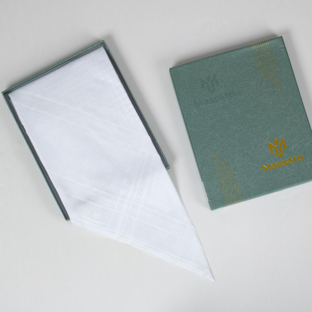 شماغ مسارو Massaro أبيض سيجنتشر بخامة قطن فاخرة وملمس ناعم، تصميم راقٍ يعكس الأناقة والبساطة، مناسب للإطلالات الرسمية واليومية.
